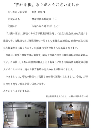 椎茸は、温度と湿度管理が重要で、菌床や椎茸の保管には低温貯蔵庫は必需品です。この度は、「赤い羽根共同募金」より助成して頂き念願の低温貯蔵庫を購入することができ、更なる椎茸栽培の売上の向上が期待できます。
